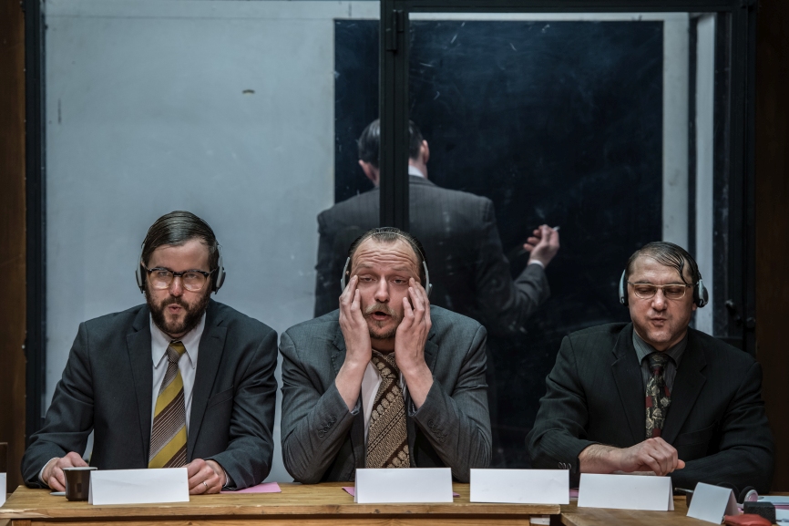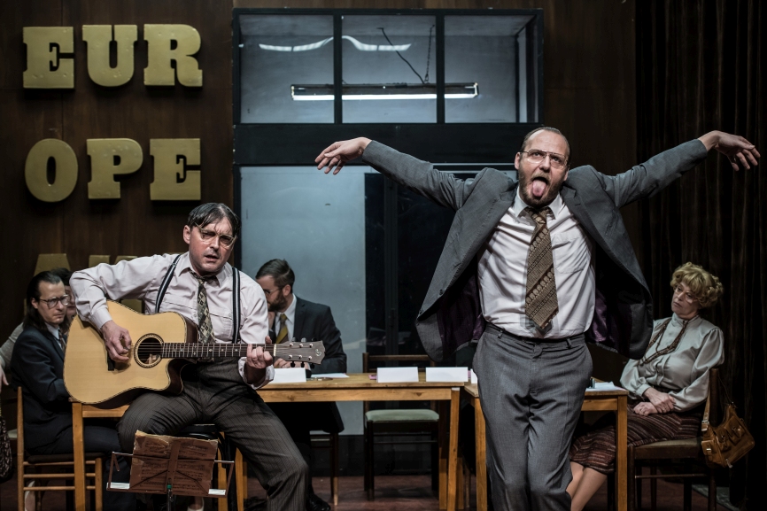 In seiner szenischen Umsetzung komprimiert der Regisseur Jan Mikulášek Ouředníks Europabild auf ein Firmenmeeting, in dem acht (zunächst) seriös anmutende Schauspieler*innen die Geschichte erzählen und durchleben. Im Sitzungsraum mit angrenzendem Raucherzimmer spielen sich die großen Katastrophen der Menschheit im Detail ab – Aktentaschen, Kaffeetassen und Papierstapeln wird dabei eine ganz besondere Rolle zuteil. Als assoziationsreiches Mittel setzt Mikulášek, ein künstlerischer Bruder Christoph Marthalers, Einspielungen und Live-Musik virtuos ein.